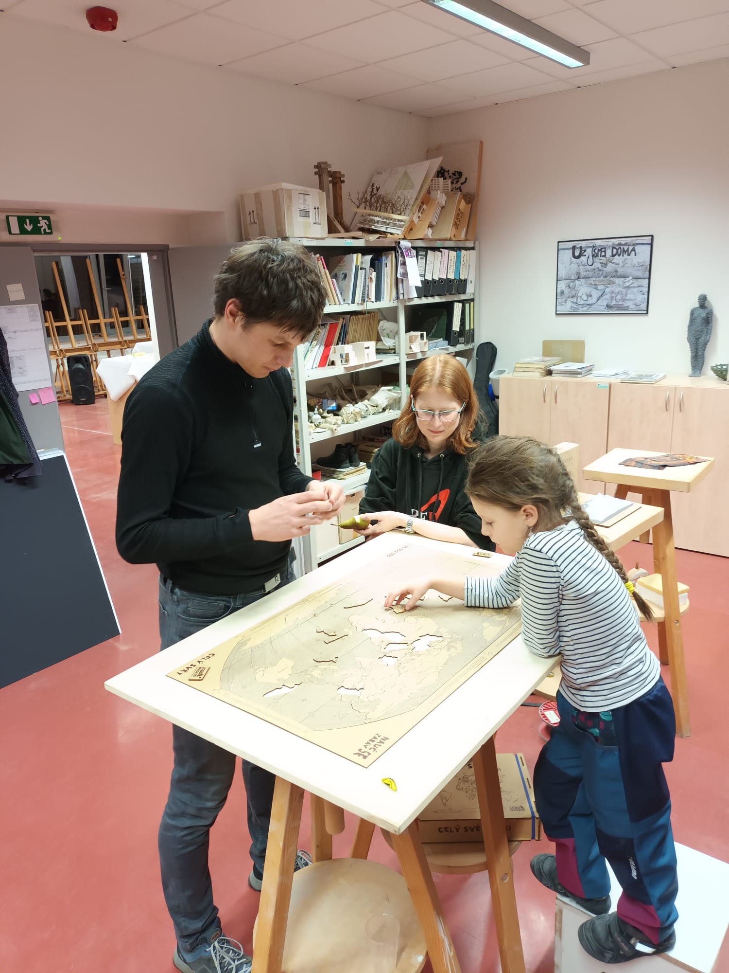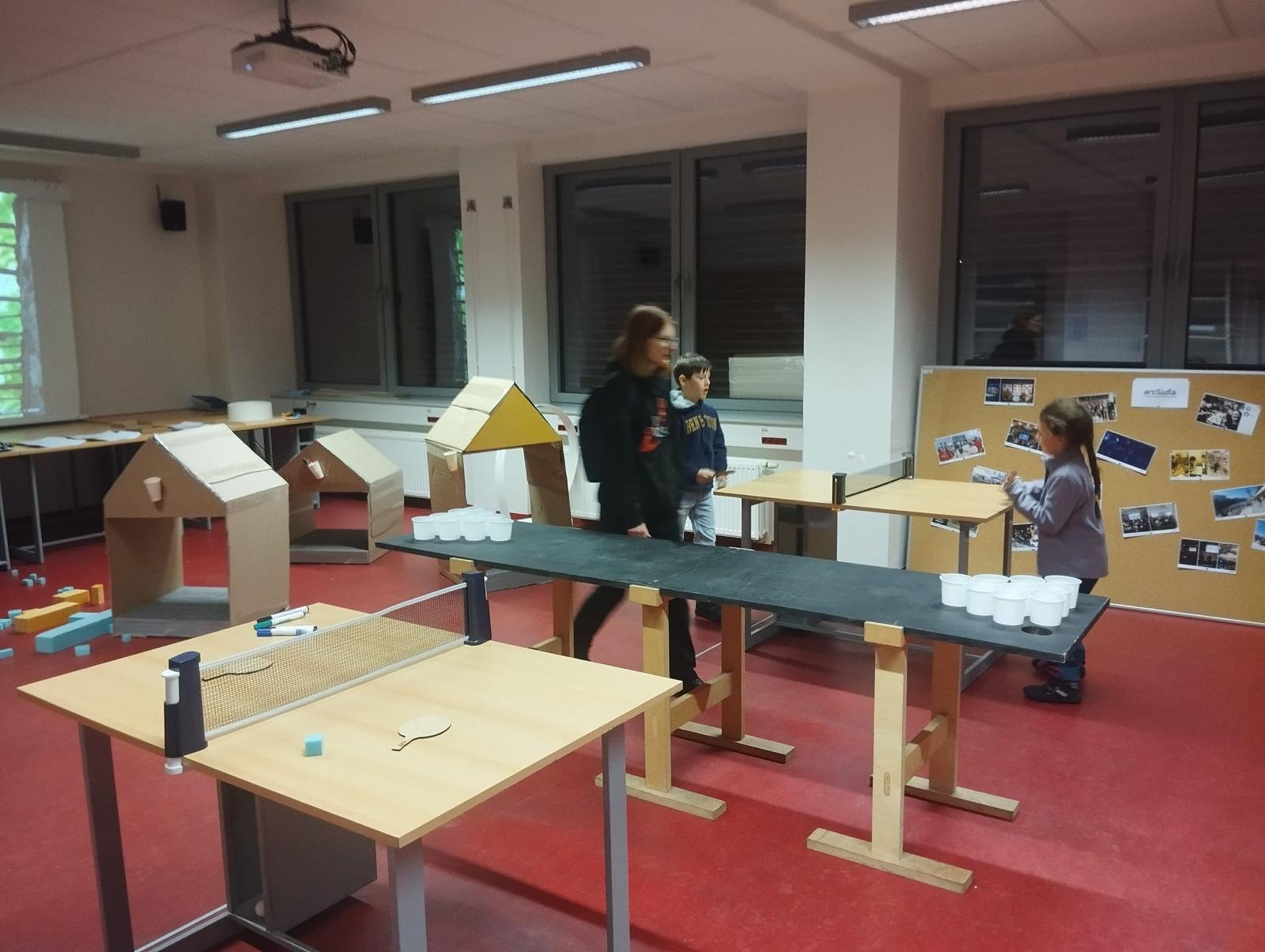 Program byl pestrý a hravý. V budově probíhalo několik projekcí, výstava studentských prací, ale také netradiční aktivity – například „cvičebna“ s činkami či Stavařský pingpong, kde klasické pálky nahradily fanky, zednické lžíce nebo hladítka. Nechyběl dětský koutek, mini pingpong ani improvizovaná kavárna s drobným občerstvením a vínem, která se přirozeně stala místem setkávání a debat.